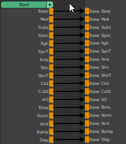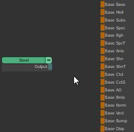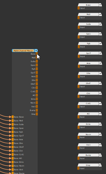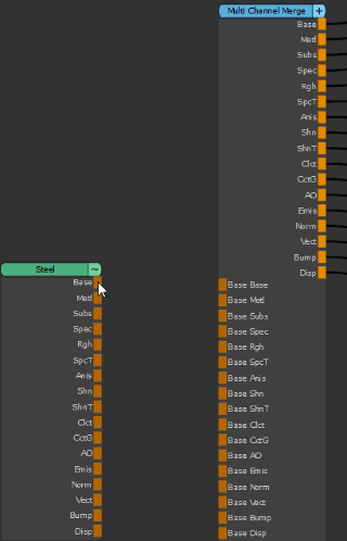 If you are connecting a source node with shader model driven output ports, such as a Multi-Channel Merge node, to another Multi-Channel node or the Output nodes within a Material node, you can connect just one stream of the source node's output ports to its corresponding input, and all sibling output ports automatically connect to the sibling stream. If an output port has an existing connection, its stream is skipped.