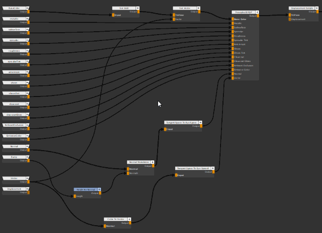 Complex Node Graphs can become difficult to read with pipe overlaps, but Mari allows you to bend pipes using a specialized node called Dot. The Dot node doesn't have any special controls like regular nodes, but it can be used to direct pipes away from congested areas of the Node Graph.