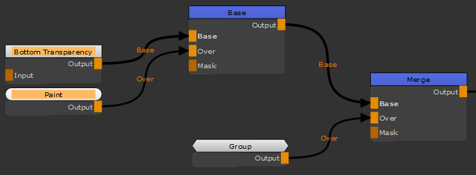 A Group node with the required number of Input pipes and one Output pipe is added. For example, if you have three nodes that are connected to nodes within the Group, Mari creates three inputs for the Group node.