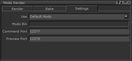 In order to perform the previewing, rendering, and baking functionality that relies on Modo, you need to specify a few settings. You can do this directly within the Modo Render palette, instead of needing to check the Preference dialog.
