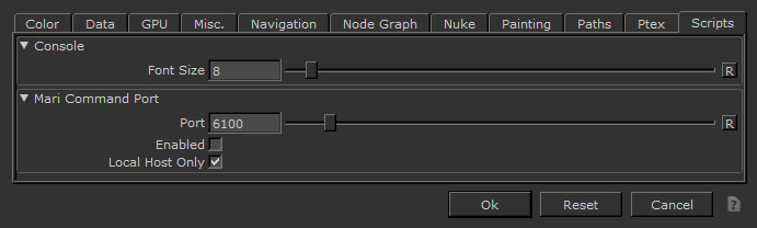| 2. | Select the Scripts tab and ensure that the Mari Command Port is Enabled. The default Port number should only be changed if it is already in use by another application. This number should match the port number set in |