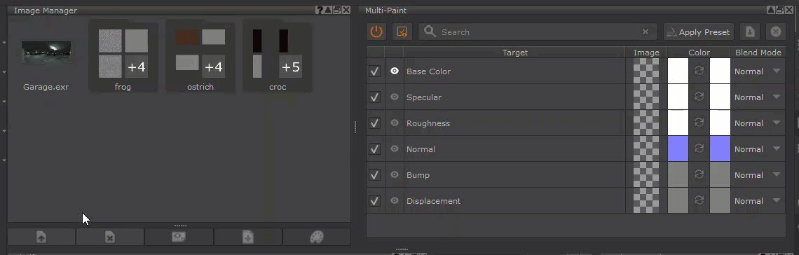 You can assign a shader model to the group and manually specify images that correspond to the appropriate stream. Once you’ve assigned the images, drag and drop the Image Group into the Multi-Paint palette, and the images will be projected in the appropriate streams at once.