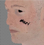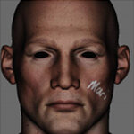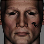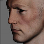 Projected back onto the model, and rotated to show the blurring where the projected image “wraps” around the surface at the nose and cheek. |