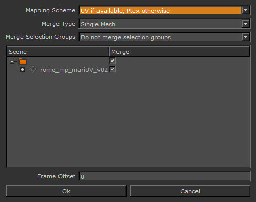 | 5. | Set a Frame Offset to specify the start position for loading the objects on the Mari timeline. |