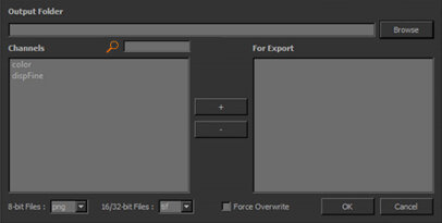 At the bottom of the dialog, the 8-bit Files and 16/32-bit Files dropdown menus list all of the file formats in which you can export your channels for use in Maya. Before you select OK, make sure you set your desired file format. |