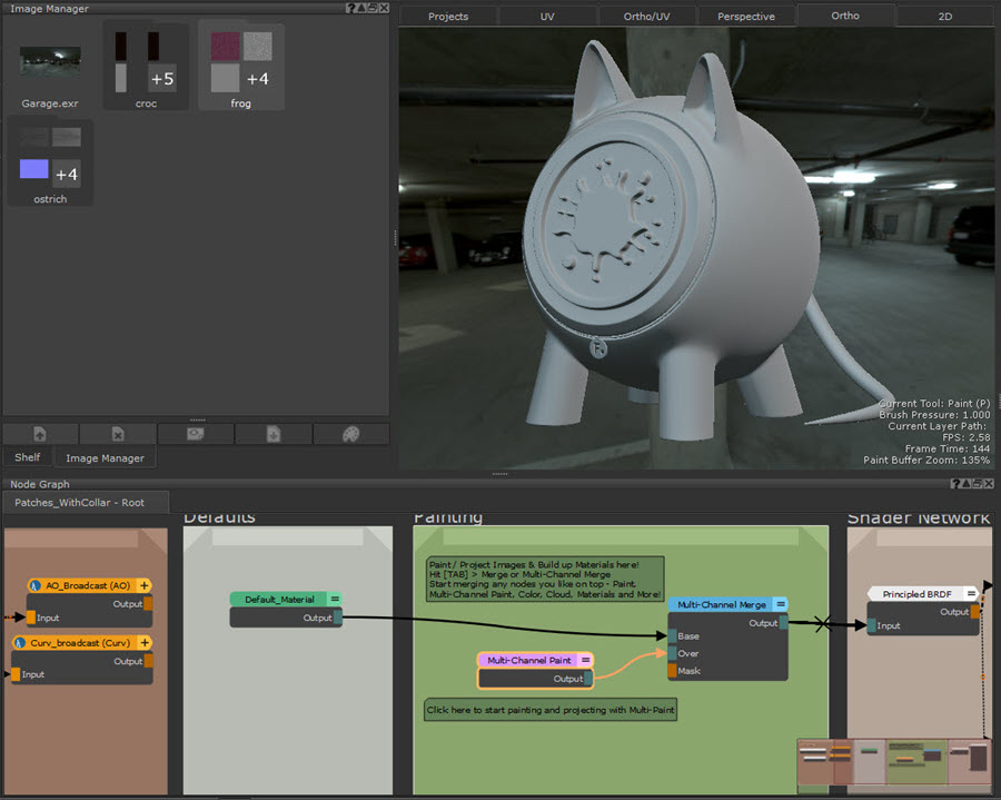 Mari 7.5 introduces Patches, a new example project for you to experiment with Multi-Paint (and any other tool in Mari you want to try). To access this project, go to Help >Example Projects > Create Patches ShaderCat Project.