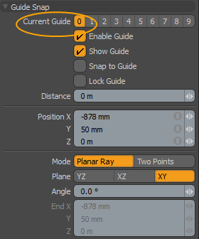 When using the Two Points mode of the guide function, the position option determines the start point of the guide. A straight line is drawn between this value and the end value that represents the guide line itself. When using the Planar Ray option, the Position value determines the home position for the guide. |