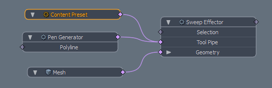 The example below shows a Content Preset used by a Sweep Effector to draw a Profile along a polyline that is generated by a Pen Generator.
