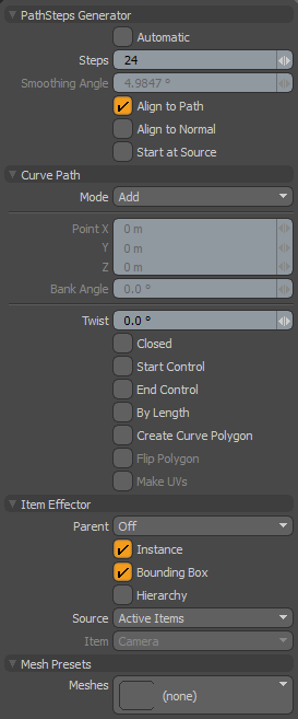In addition to the PathSteps Generator and Curve Path properties described in the Curve Clone topic, the following properties are available for the Curve Instance tool: