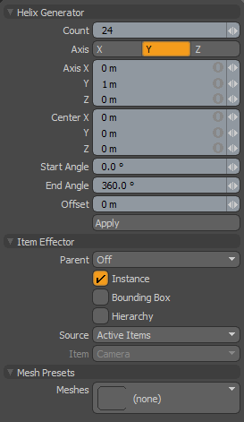 In addition to the Helix Generator properties described above, the following parameters are available for the Instance Radial Array tool.