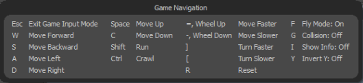 In the Game Tools layout, you can use game navigation to move through the 3D world in perspective or camera view, using a set of shortcut keys. This can be useful, for example, when exploring a level design. When you enter game navigation mode, the mouse cursor disappears and standard shortcut keys are disabled.