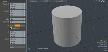 Tip: Try altering the value of Segments to see how the cylinder changes. As you increase the value, you'll see how more polygons are used to build the sides.