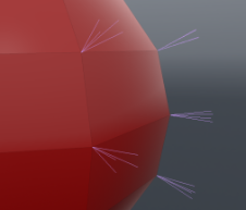 To help visualize the effect of different smoothing settings, Modo lets you display the normals on each vertex. When soft shading, the neighboring polygon normals are averaged to create a single vertex normal. For other types of shading, such as hard shading, different normals are used for each polygon to lessen the visual continuity. The images below demonstrate normals at three different settings of Hardness.