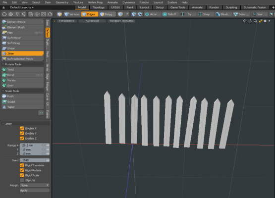The following is an example of using the Jitter Tool to create a fence with random spacing between each post. This is done by duplicating using the Clone tool. By default the Jitter is applied to the vertices. By enabling the Rigid Translate, Rigid Rotate, and Rigid Scale options, all the duplicates are treated as individual objects. Use these options to quickly create real geometry without having to use Replicators.