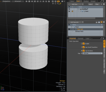 | 5. | In the Properties panel, open the Edge Split tab, set the Gap value to 875mm, and enable Cap Sections. |