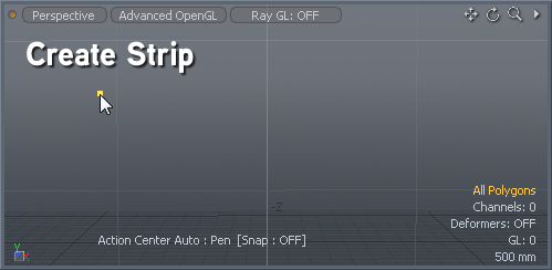 Found in the menu bar under Geometry > Polygon > Quadruple or, within the Topo tab toolbox, the Convert to Quadrangles command takes a series of vertices from an N-gon and creates a row of regular four sided (quadrangle) polygons. This is useful in creating quad strips, especially when re-topologizing a model. Using the Pen tool, lay down two opposing rows of vertices, then invoke the Convert to Quadrangles command and Modo automatically adds edges spanning between the opposing vertices, making quad polygons.