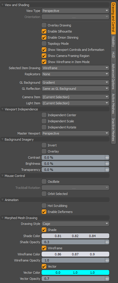 • Enable Independent Drawing - The Display Viewport allows you to define custom display options for each item layer. By default, the Enable Independent Drawing option is enabled and these custom drawing options display in all viewports. When enabled, all custom drawing options are ignored for active meshes.