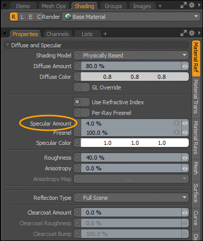 Effectively, the Use Refractive Index option remaps the standard Specular Amount range (0% - 100%) to an Index of Refraction range (1.0 - 1.8), which attempts to cover majority of materials. For example, with Specular Amount set to 50% , the Refractive Index (IOR) is 1.5, which is a good approximate value for most materials (most of which fall within the Refractive Index (IOR) range of 1.4 - 1.6).