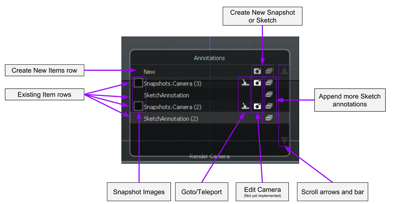 Clicking these creates one of the following: • New camera Snapshot annotation - Creates a camera at the present location. • New Sketch annotation - Immediately goes into Sketch mode, holding the trigger to leave the sketch trail. |