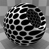 The Dots texture creates a grid-like pattern of dots across the surface of the mesh. The dots default to a fairly uniform position with hard edges, but you can modify the options to have different placements or soft-ramped dots. The dots are procedurally created at render time; the texture has no fixed resolution and can be magnified with no visual loss in detail.
