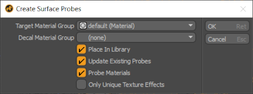 Right-click the material group you want to bake your material onto in the Shader Tree and select Create Surface Probes.