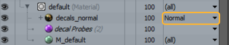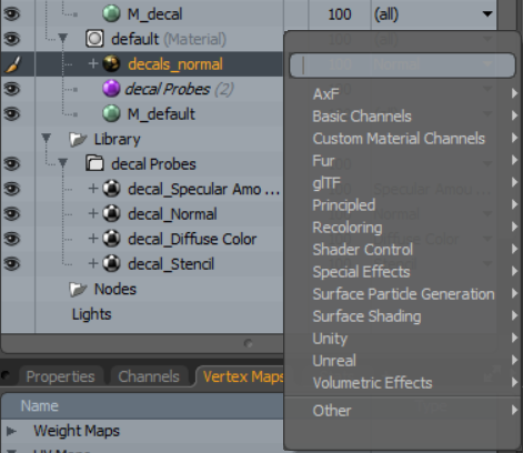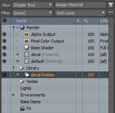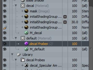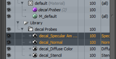 If Place in Library is enabled, a new surface probe material item is added to the material selected in the Target Material Group parameter. A new folder called Decal Probes also becomes available within the Library folder in the shader tree. The decal Probes folder contains texture layers corresponding to any layer effects within the material set in the Decal Material Group parameter.