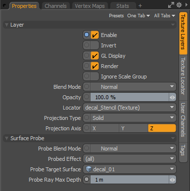 • Probe Materials applies any changes in the material item within your decal material group, such as changes to your diffuse or specular colors. If you want to ignore the material item within your decal and only transfer textures to the surface of your receiving mesh, disable this option.