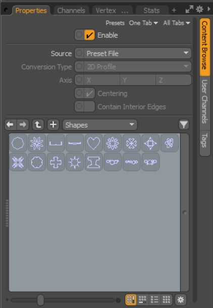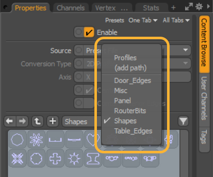 Within the Tool Pipe of the Particle Plane operator, is a Content Preset operator. The Content Preset generator allows you to select preset shapes, profiles that ship with Modo, or any custom presets you may have created.