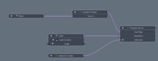 Connect the Content Preset node to the Tool Pipe port of the operation you want the preset to be applied to. For this example, we are using a Poly Bevel.