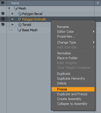 When you have a long list of mesh operation, it may be useful to simplify your stack. Modo allows you to consolidate your mesh up to a particular operation, using the Freeze command. This way, Modo only evaluates the stack until the selected operation.