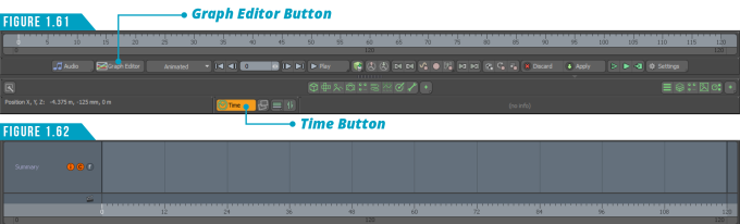 Clicking the Time button at the bottom of the Layout will display Modo’s Timeline (Figure 1.61). The Timeline allows you to control time in an animation. To animate any item over time, you only need to set a specific value at a point in time (known as a keyframe) and then move to a different point in time to set a new keyframe.