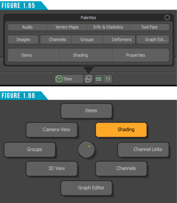 The Palettes Popover (Figure 1.65) is located to the left of the Status Bar. Clicking the icon will display a popover which gives you quick access to opening common palettes such as the Graph Editor and Deformers List. For a complete list of palettes to choose from use (Layout/Palettes) from the Application Menu. You can also access eight palettes using the hotkey (Alt+`(backtick)) to open a Palettes Pie Menu (Figure 1.66).
