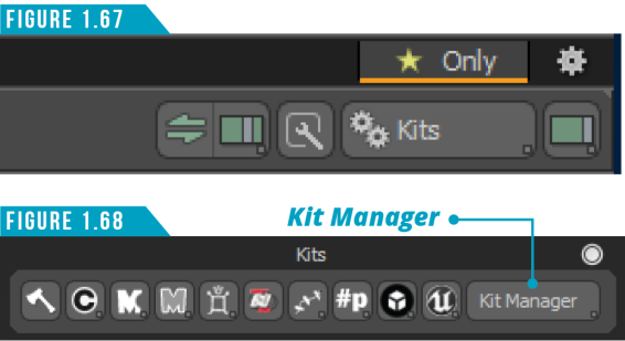 The Kits Popover (Figure 1.67), located in the upper-right corner of the interface, gives you access to these add-ons. Clicking the Kits button will display the kits you have installed and give you the ability to enable and disable kits as well as set their visibility using the Kit Manager. (Figure 1.68)