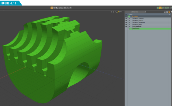 Live procedural booleans (Figure 4.11) are my favorite set of features when working with procedural modeling. They allow for true freedom while working with Booleans in Modo. Being able to make changes to the base mesh as well as the driver meshes at anytime has brought me back to working with booleans after years of avoiding them due to feeling restricted with direct modeling. I highly recommend giving them a try.