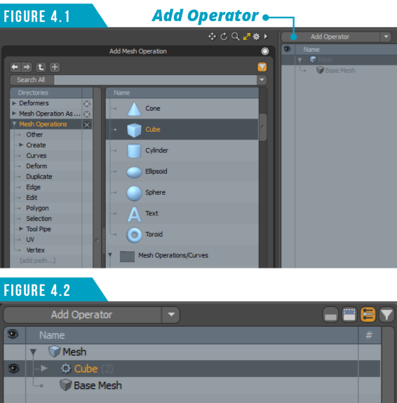 Click the Add Operator Button, and then locate the Cube mesh operation (meshop) (Figure 4.1). Double click on the Cube meshop to add it to the Mesh Operation List (Meshop Stack) (Figure 4.2).