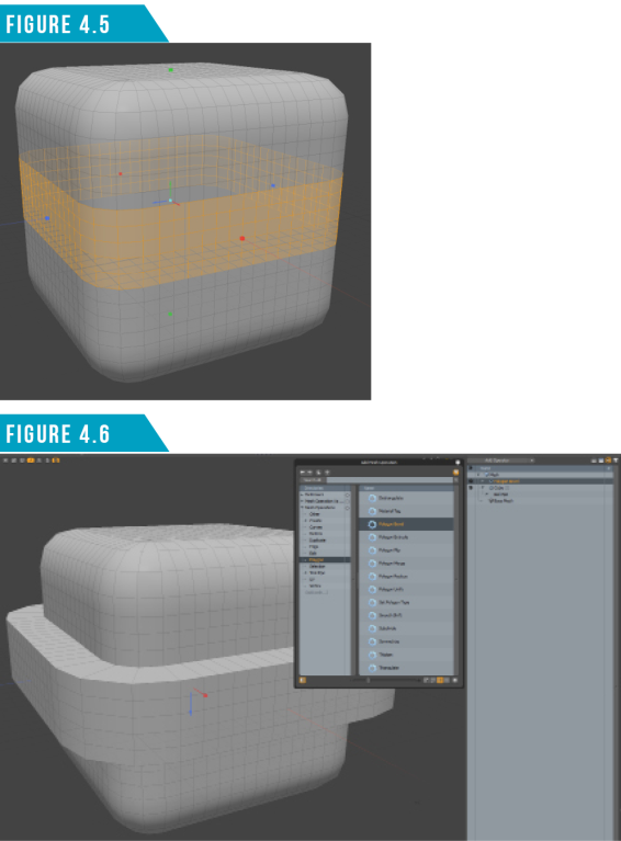 Select some polygon loops in the center of the cube as seen in (Figure 4.5), add a Polygon Bevel meshop to the stack and then adjust the Shift attribute for the Polygon Bevel to 150 mm (Figure 4.6).