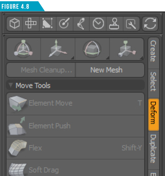 That’s right. Procedural meshes contain no active data to operate on in the eyes of direct modeling tools. If you look over at the Model Toolbar when a procedural mesh is selected, all of the tools will be ghosted (Figure 4.8).