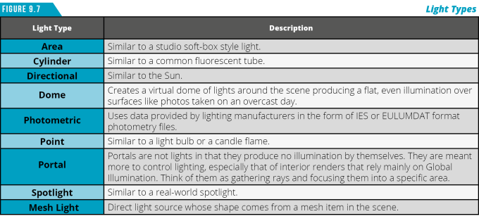 Modo has nine unique light types (Figure 9.7) that simulate real world sources of illumination. When you have time to experiment, you should explore the different light types so that you are aware of what is available for future projects. For this scene we’ll stick with Area Lights.