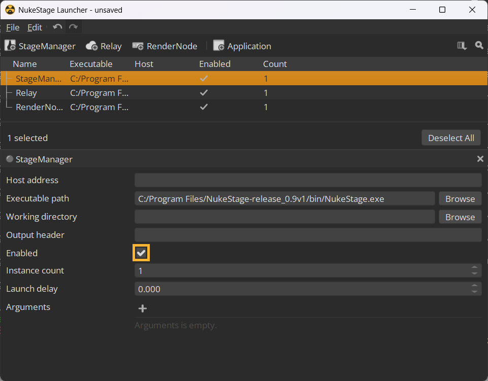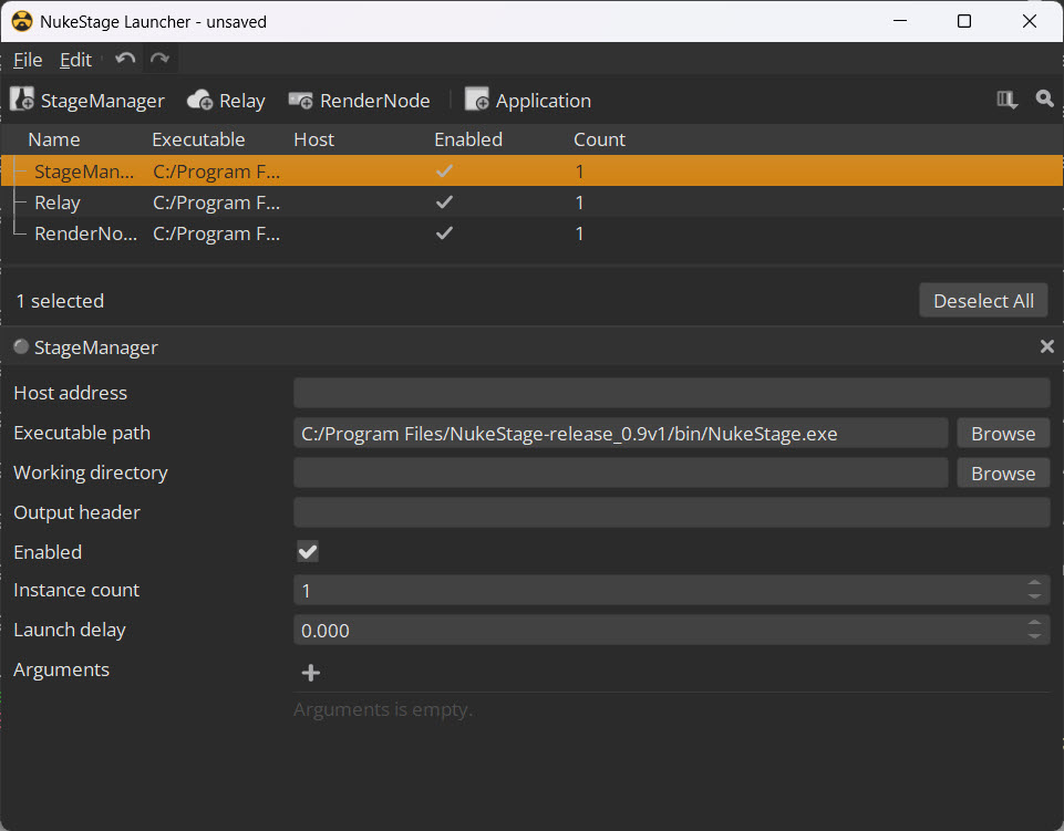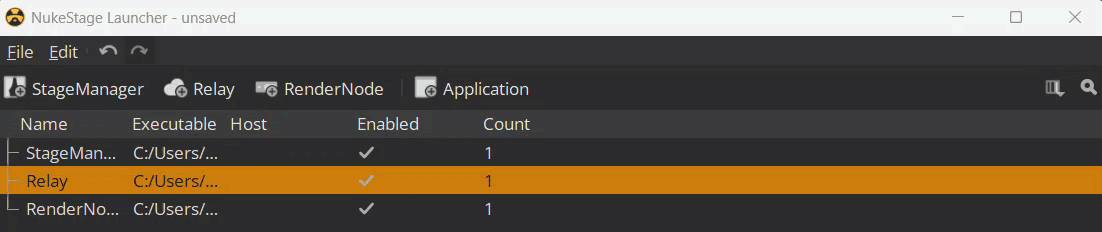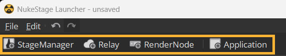 2. | A new window will appear. Add the applications you wish to launch using the buttons at the top. Usually you will need StageManager, Relay, and several RenderNodes. Throughout this launcher process, StageManager represents the NukeStage Editor application. |