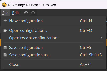 6. | Go to the File menu and choose Save configuration to save these config settings as a .json (*.nkslaunch) file. You will then need to use this .json file in Step 2: Run NukeStage Listener below. |