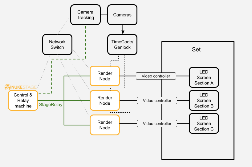 The headless process running in the background. The Relay will do all the communication between the RenderNodes and the NukeStage Editor and will also receive and distribute the tracking data. In most cases the Relay will just run on the Control machine with the NukeStage Editor, but it could run on a different machine if needed.