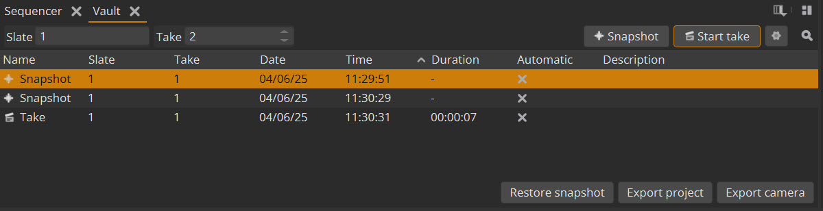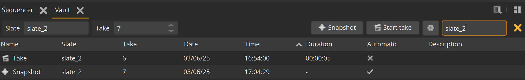 The Vault panel has some general controls for managing your Snapshots and Takes. Further details about specific workflows are in the Snapshots and Take Record sections: