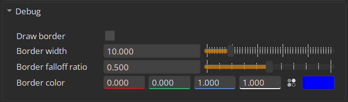 The camera parameters also contain a Debug section which enables camera borders around each camera render using the Draw border tickbox, as well as parameters for customizing that border.