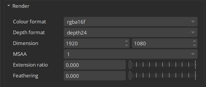 The Camera Parameters also contain a Render section which allows you to specify the Color format, Depth format as well as the Dimension (resolution) at which to render the camera.