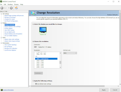 | 2. | Select the resolution marked as (native) in Resolution > PC. For example, below image uses 3840 × 2160 at 60 Hz. |