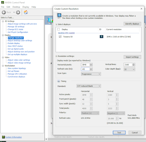Using a native resolution is the safest approach, but frequently this native resolution won’t match the desired frequency for the setup. In this case, a Custom Resolution is needed. To create this, follow the below steps: