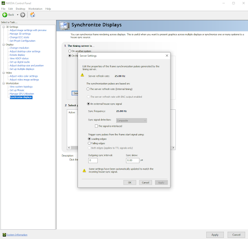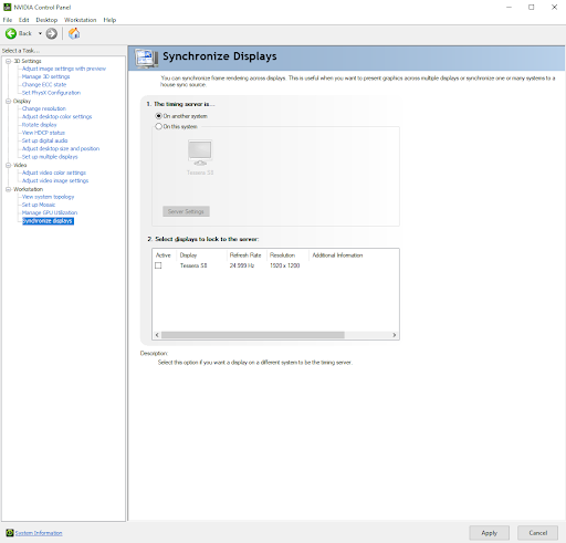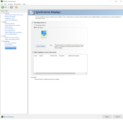 | 1. | In the NVIDIA Control Panel, navigate to Workstation > Synchronize Displays. |
