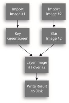 In the image above, you see an example of a very simple Nuke script. Two Read nodes reference media on disk. Effect nodes extract a matte and blur an image. A Merge node set to over, composites the foreground image (input A) over the background image (input B). Finally, a Write node renders and outputs the completed composite to disk. There is also a Viewer node, which displays the output of any node in the script.
