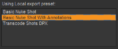 If you do not change the export settings, the Using Local export preset setting control just uses the default setting of Basic Nuke Shot With Annotations.