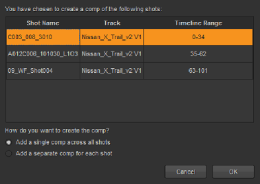 | 4. | To create one Nuke Comp for all the track items, select the Add a single comp across all shots radio button. Or, if you want to create a Nuke Comp for each of the selected track items, select the Add a separate comp for each shot radio button. |